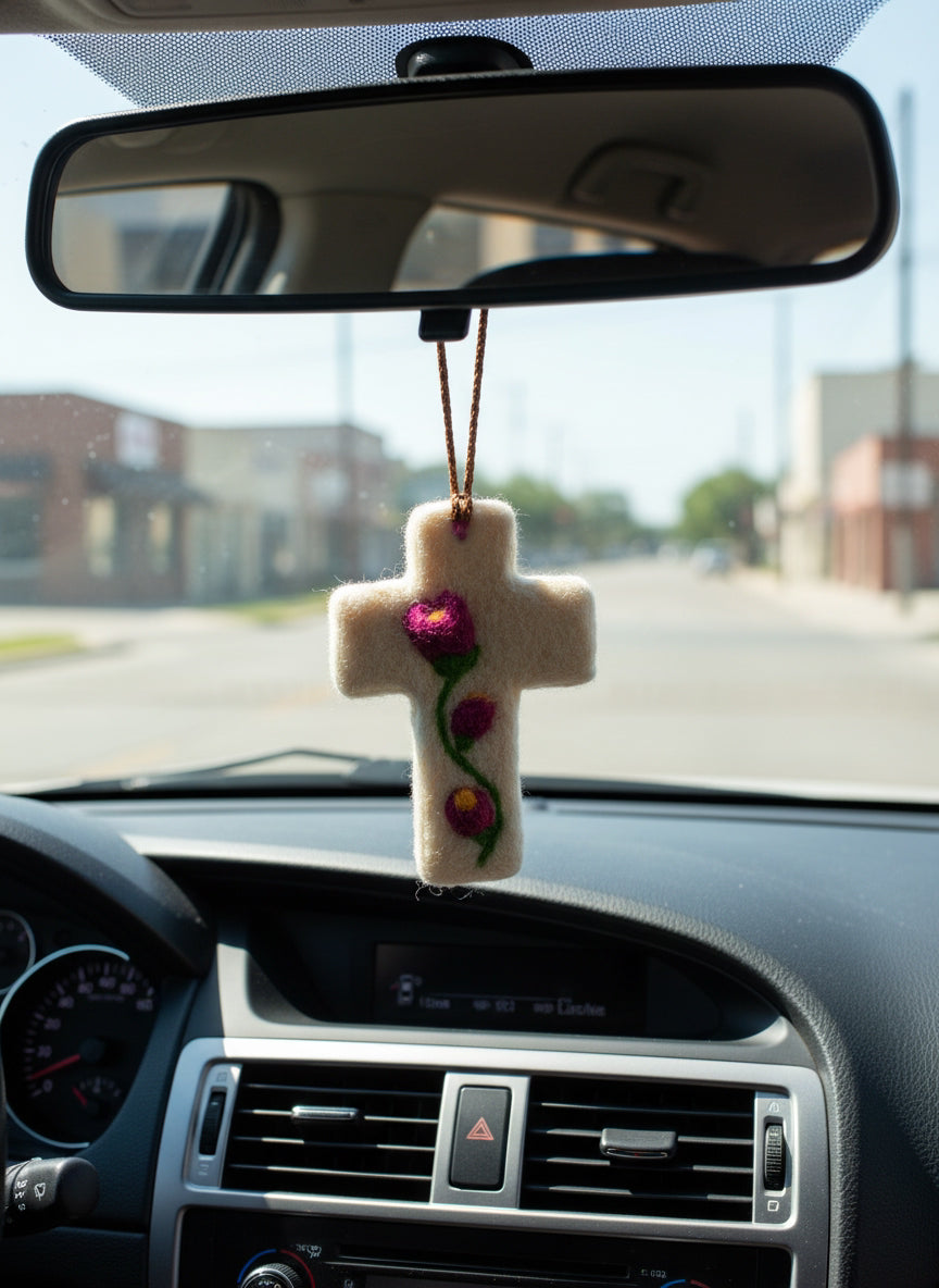 Bring some groovy vibes into your space with our Flowered Cross air freshener. Handmade from soft wool and adorned with colorful flowers, it freshens your air while adding a touch of divine charm. Perfect for your car or room, it’s a small piece of peace and nature to keep your good vibes flowing.