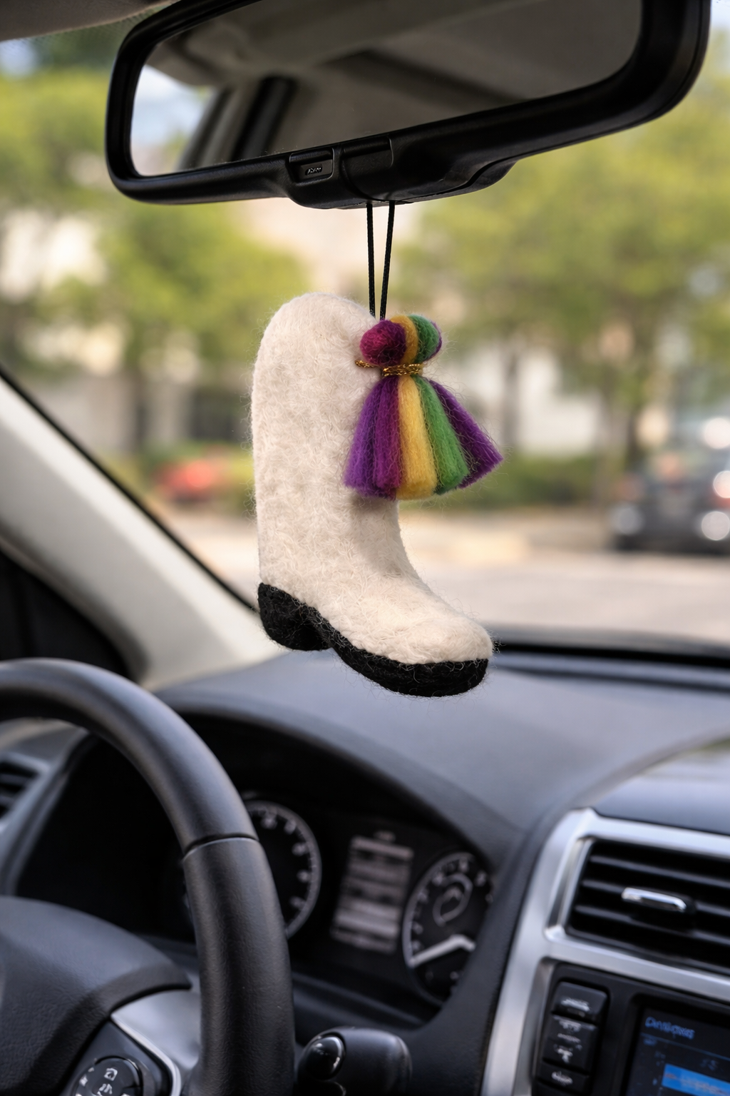 This handcrafted Marching Boot Freshie brings a little parade energy to every drive. Made by hand with care, this felted wool boot features classic black soles and a festive purple, green, and gold tassel that swings with every turn of the road.